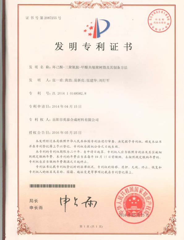 我司于2016年5月25日又榮獲一項國家發(fā)明專利“環(huán)己酮-三聚氰胺-甲醛共縮聚樹脂及其制備方法”。