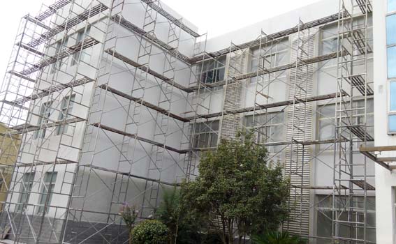圖三:辦公樓外墻正在裝修中的部分。